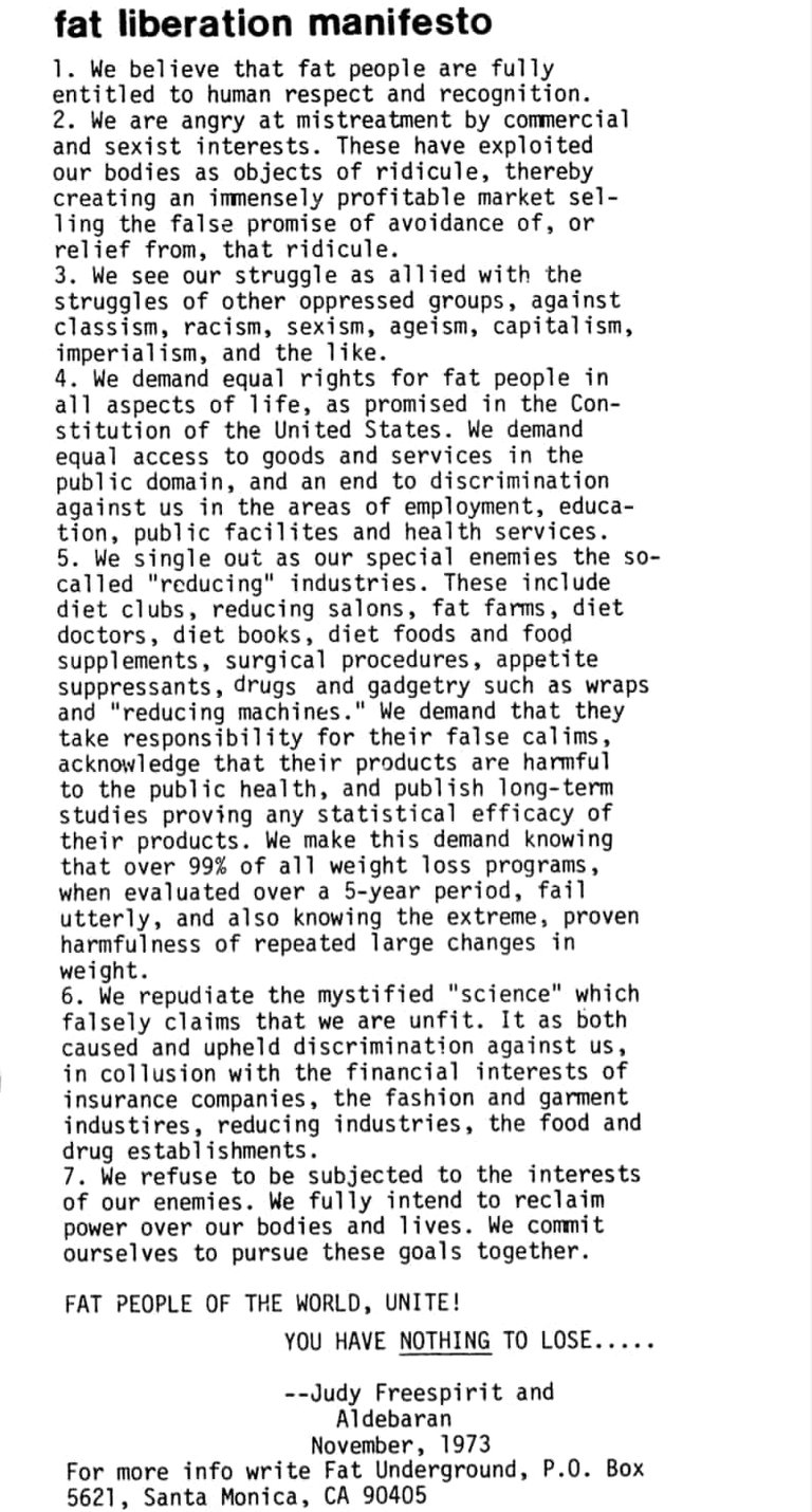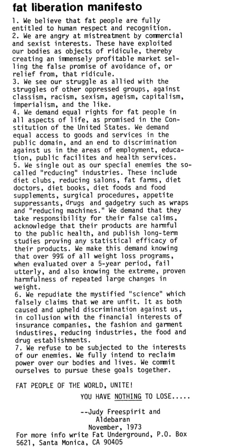 The fat liberation manifesto was published in 1973 by Judy Freespirit and Aldebaran. It expresses the ideas and demands of the radical feminist initiative "Fat Underground".